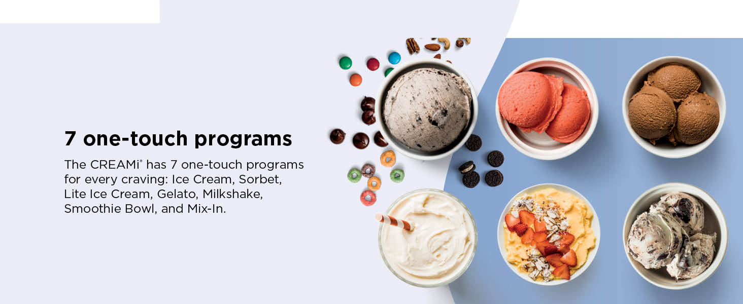 With 7 preset programs and Creamify Technology®, you can create a wide range of frozen treats: ice cream, lite (low-calorie) ice cream, sorbet, gelato, milkshakes, smoothie bowls, and mix-in treats. It works with endless ingredient combinations—from healthy, high-protein bases to indulgent, sweet recipes.