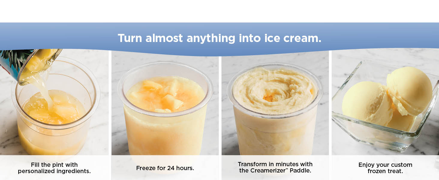 - Place the frozen pint in the machine, select a program, and let Creamify Technology® shave and churn the solid base into a velvety, creamy treat.